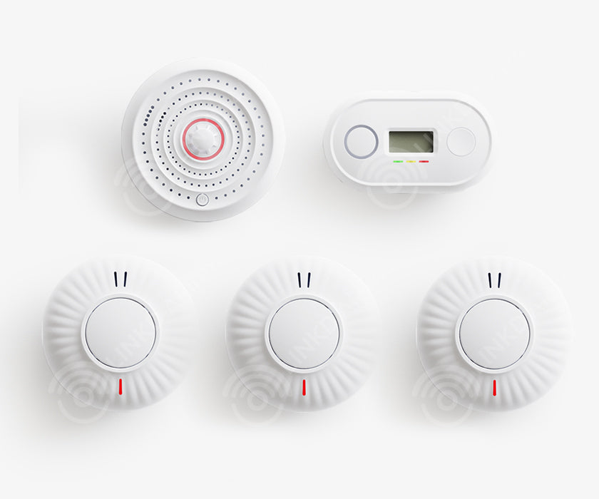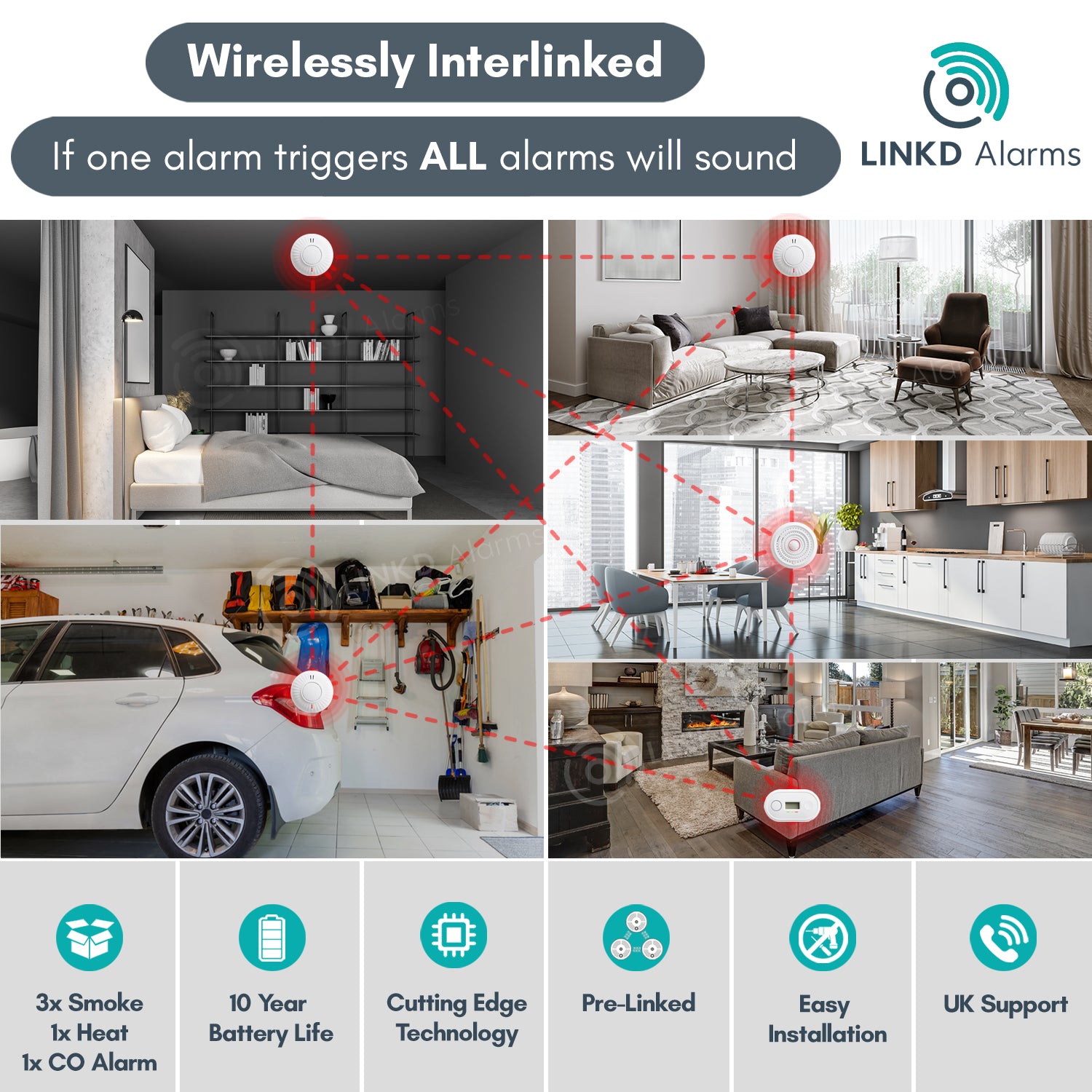 Contains - 3x Smoke Alarm, 1x Heat Alarm, 1x Carbon Monoxide Alarm