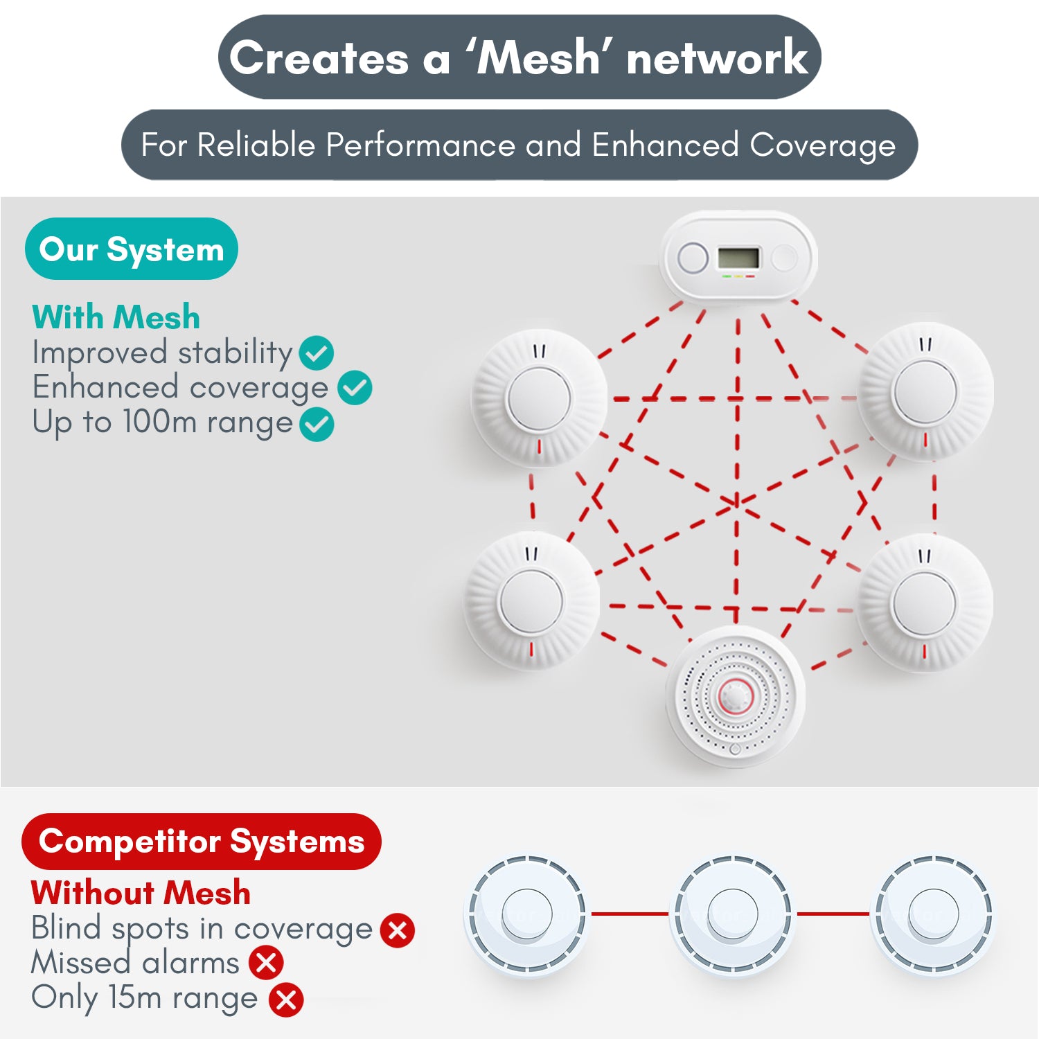This is opposed to competitor systems where each alarm only connects to the nearest single alarm, creating potential blind spots in coverage and missed alarms.